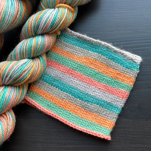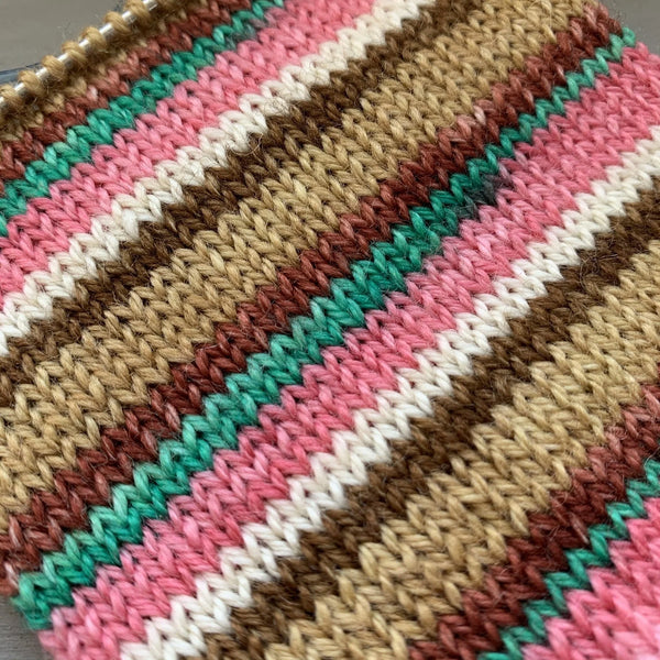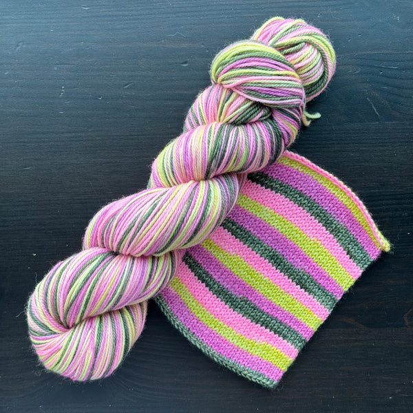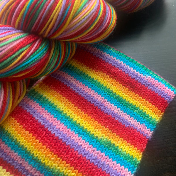 Comfy Cozy Knits hand dyes self striping sock yarn in Edmonton, Alberta. The bold colours stripe as you stitch away, great for socks, hats, mitts and more!