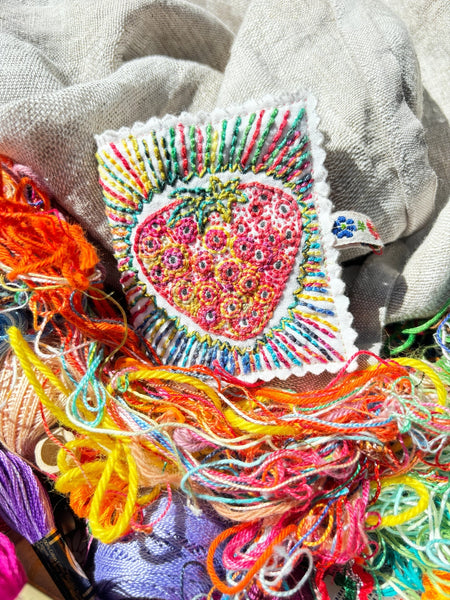 The kit includes printed Strawberry & Rainbow Embroidery panel, embroidery hoop, needles, wool for the lining, a snap, ribbon, threads for embroidery and directions.